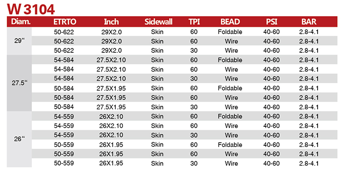 W3104-Billy Goat is a basic XC tire for entry level, light and easy to ride. Wedge style has strong direction design for dry/dirt that easy to drain from ceter to shoulder.Also Billy Goat "V" waved tread design has strong rolling direction to break the way for your ride.